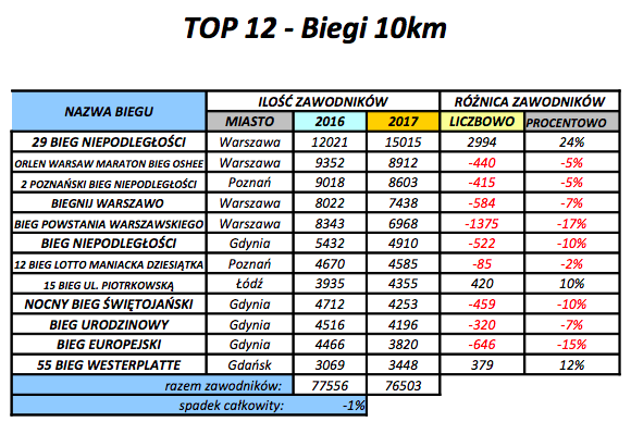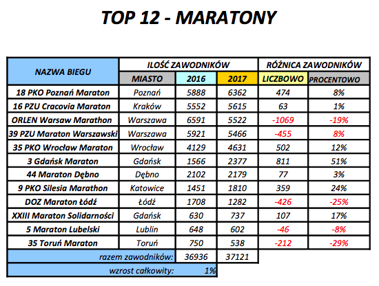 Statystki za 2017 rok wskazują na to, że rynek biegowy w Polsce się stabilizuje. Dla 12 największych maratonów całkowity wzrost frekwencji wyniósł zaledwie 1 procent, mimo że więcej uczestników niż rok temu przyciągnęło 7 imprez. Największy odpływ biegaczy zaliczyły oba warszawskie maratony – ORLEN Warsaw Marathon (1069) i 39. PZU Maraton Warszawski (455).
