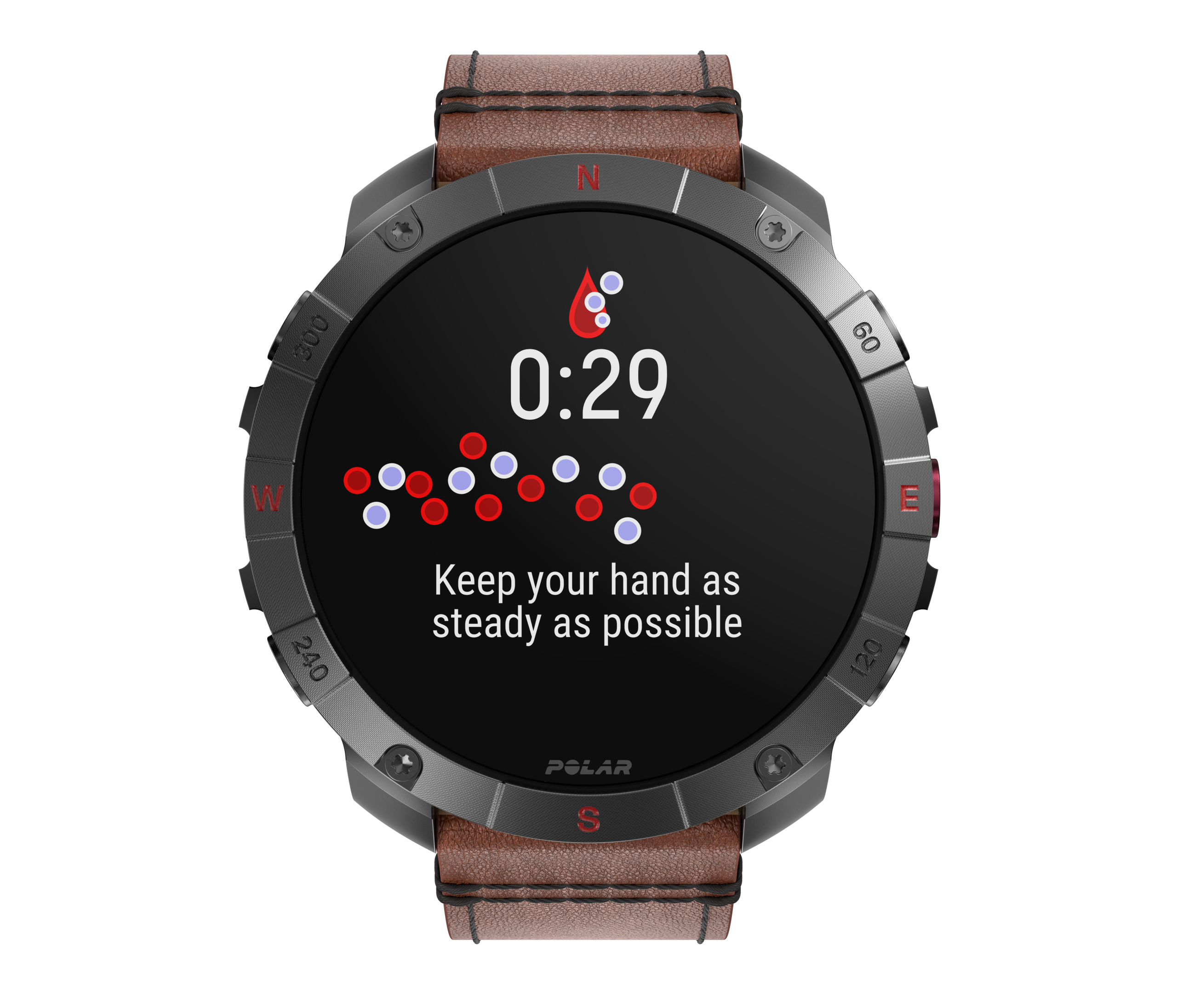 Pomiar EKG na nadgarstku: Polar zaimplementował pomiar EKG poprzez elektrody na dolnej obudowie i jednym z bocznych przycisków. Aby wykonać test EKG, w aplikacji zegarka wybieramy funkcję Elektrokardiogram, a następnie dotykamy palcem drugiej ręki wyznaczonego przycisku i czekamy 30 sekund w bezruchu.