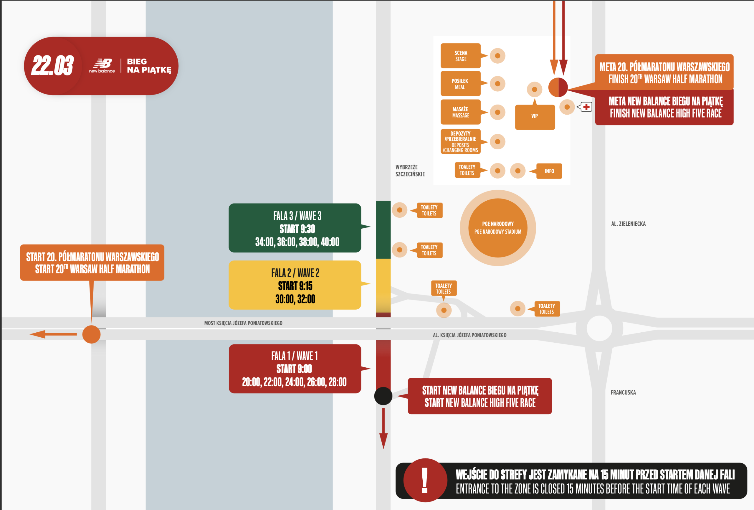 Każda strefa startowa będzie zamykana na kwadrans przed wystrzałem startera, dlatego biegacze powinni odpowiednio zaplanować przybycie na miejsce zawodów. Osoby, które nie zdążą na swoją falę, będą mogły ruszyć w kolejnej.
