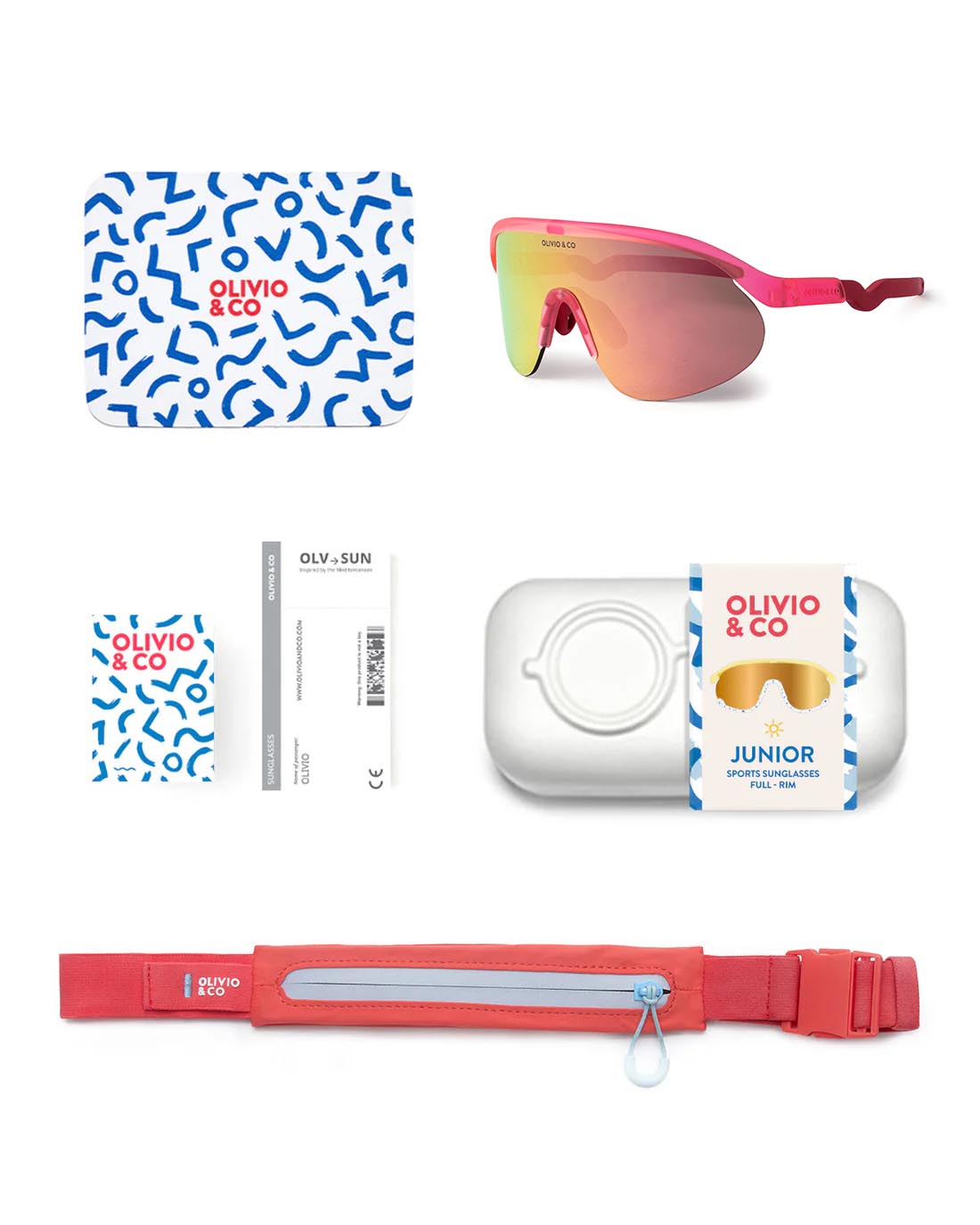 W zestawie znajduje się praktyczna sportowa nerka, która pozwala bezpiecznie przechowywać okulary. Wyposażona w element odblaskowy zwiększający widoczność oraz silikonowy uchwyt zamka, sprawdza się również w trudniejszych warunkach, nawet gdy ręce są mokre lub spocone.